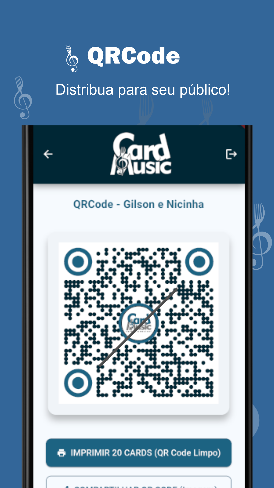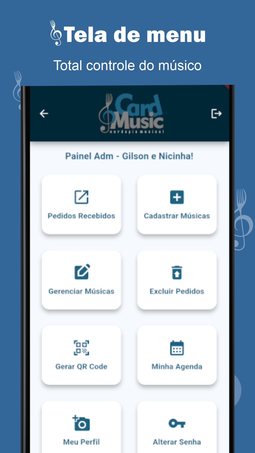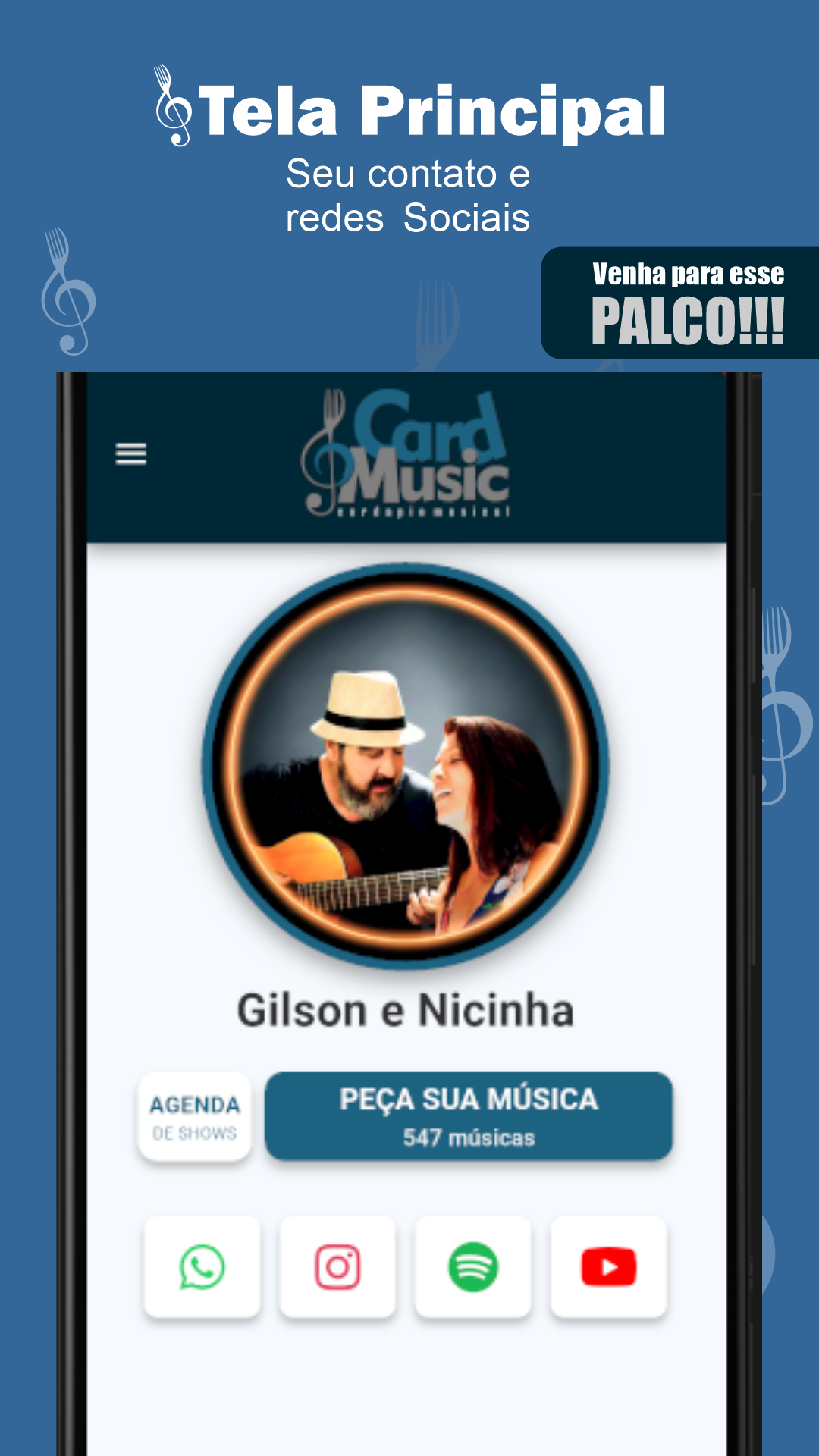Gerencie seu repertório, receba pedidos na hora. Abra a cifra com apenas 1 clique e sem perder tempo procurando a música. Seu contato, sua agenda e redes sociais na palma da mão do seu público! Ícone para copiar seu pix direto para você!
