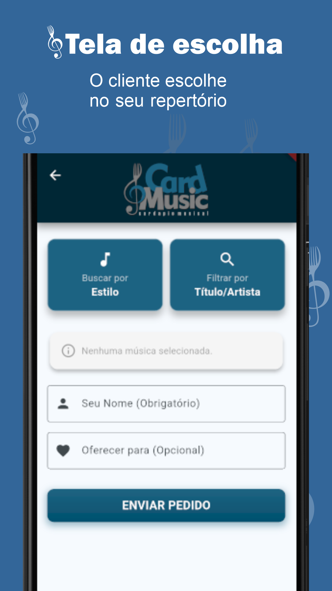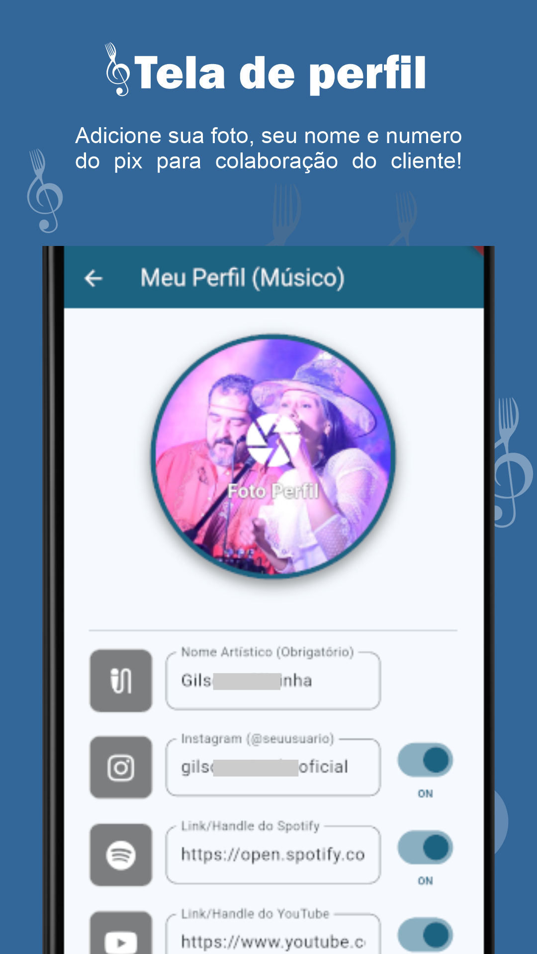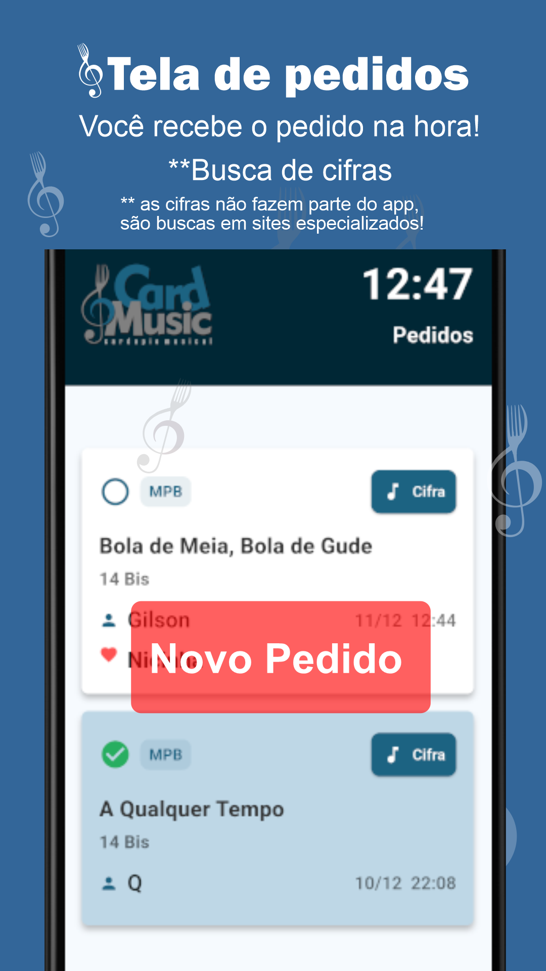 Gerencie seu repertório, receba pedidos na hora. Abra a cifra com apenas 1 clique e sem perder tempo procurando a música. Seu contato, sua agenda e redes sociais na palma da mão do seu público! Ícone para copiar seu pix direto para você!